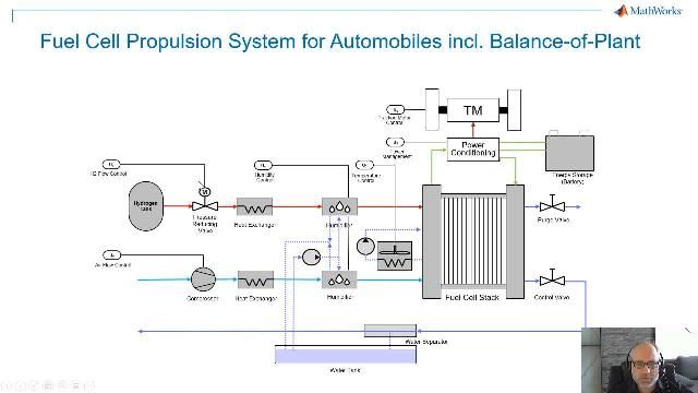 Simscape を使用すると、エンジニアは PEM 燃料電池のモデル全体をカスタマイズできます。たとえば、燃料電池スタックのほか、エアコンプレッサー、加湿器、水素再循環経路、冷却システム、水管理などのバランスオブプラント コンポーネントもカスタマイズ可能です。電気化学を用いた第一原理計算に基づく燃料電池モデルを使用することで、コンポーネントレベルおよびシステムレベルで PEM 燃料電池を開発できます。このレベルの詳細な燃料電池モデルにより、エンジニアは電流、電圧、電力監視や、熱管理などの機能をモデル化できます。