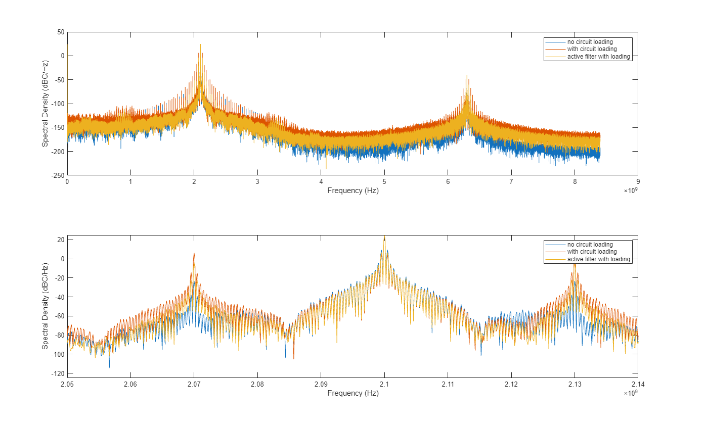 Plot the PLL output spectrum using the plotPllOutputSpectrum helper script. The primary impact of the circuit loading is a substantial increase in the spurious responses.