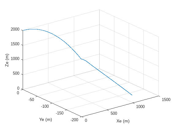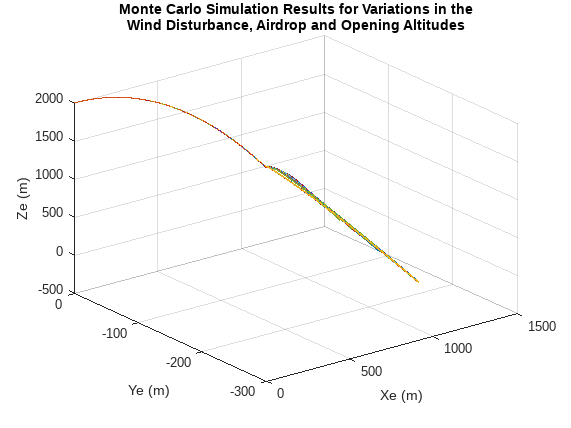figure; for simNumber = 1:1:numSim plot3(simResults(1,simNumber).yout{1}.Values.Data(:,1),... simResults(1,simNumber).yout{1}.Values.Data(:,2),... simResults(1,simNumber).yout{1}.Values.Data(:,3)); hold on; end grid on; title(["Monte Carlo Simulation Results for Variations in the";... "Wind Disturbance, Airdrop and Opening Altitudes"]); xlabel('Xe (m)'); ylabel('Ye (m)'); zlabel('Ze (m)');