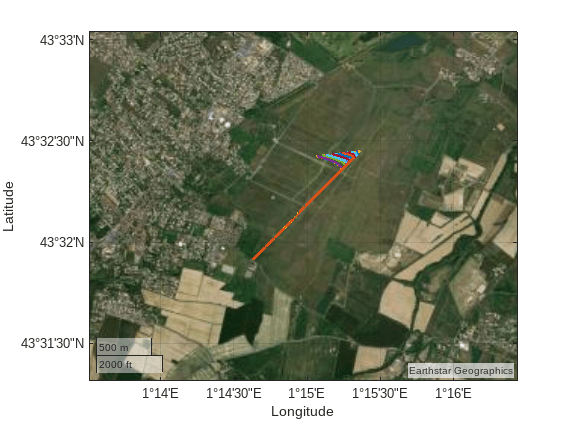 figure; gx = geoaxes; for simNumber = 1:1:numSim llaPosition = flat2lla([simResults(1,simNumber).yout{1}.Values.Data(:,1) ... simResults(1,simNumber).yout{1}.Values.Data(:,2) ... -1*simResults(1,simNumber).yout{1}.Values.Data(:,3)],... [latInitial, longInitial], headingInitial,0); geoplot(gx,llaPosition(:,1), llaPosition(:,2),'LineWidth',2) geolimits(gx,[43.5375 43.5420],[1.2495 1.2570]) geobasemap(gx,"satellite") hold on end