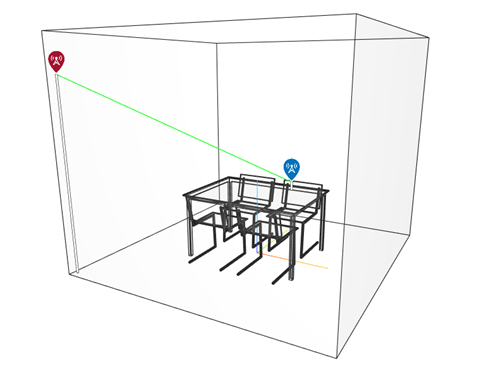 部屋の天井隅付近に送信機サイトを作成し、テーブルの上に受信機サイトを作成します。直交座標を使用してメートル単位で位置を指定します。