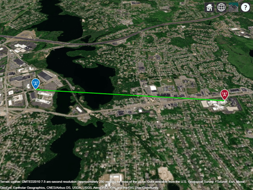 tx = txsite("Name","MathWorks Apple Hill",... "Latitude",42.3001,"Longitude",-71.3504,"AntennaHeight",30); rx = rxsite("Name","MathWorks Lakeside", ... "Latitude",42.3021,"Longitude",-71.3764);