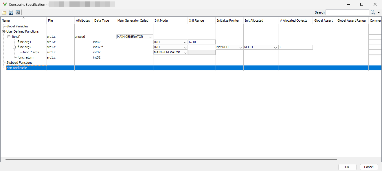 • To specify that arg2 points to a 3-element array where each element is initialized, select INIT as Init Mode, Not NULL as Initialize Pointer, MULTI as Init Allocated and then enter 3 as # Allocated Objects.