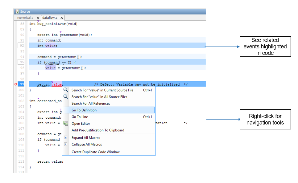 [未初期化変数] 欠陥を調べるには、変数がまったく初期化されていないことの確認が必要な場合があります。変数の前のインスタンスを調査するには、[ソース] ペインでその変数を右クリックし、[すべての参照を検索] を選択します。または、その変数をダブルクリックします。これらのオプションを使用すると、特定の変数のインスタンスのみが表示され、スコープの異なる同名の他の変数は表示されません。