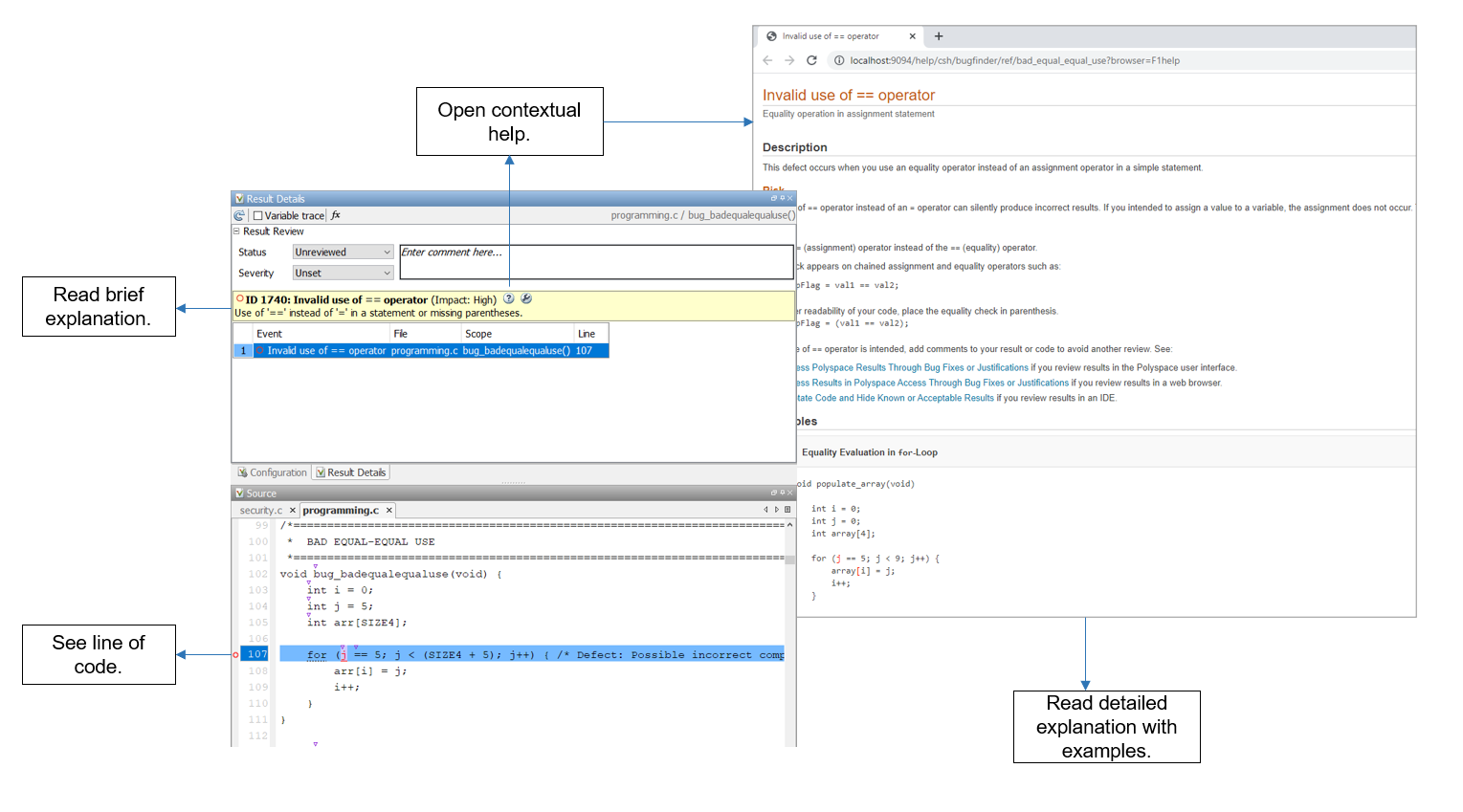 Polyspace Access™ Web インターフェイスでの同様のワークフローについては、Polyspace Access Web インターフェイスでの Bug Finder の結果の解釈 (Polyspace Access)を参照してください。