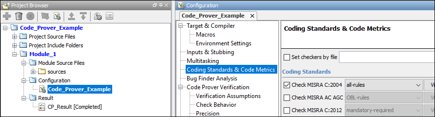 プロジェクト モジュールで [構成] ノードをクリックします。必要に応じて、[構成] ペインでオプションを変更します。たとえば、[コーディング ルールおよびコード メトリクス] ノードで [MISRA C:2004 のチェック] を選択します。