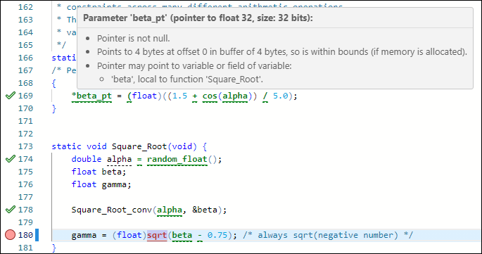 たとえば、ステートメント if(a=b) は C 言語の規格によると意味的には正しいのですが、多くの場合、意図しない代入を示しています。Bug Finder は、このような意図しない演算を検出します。Code Prover ではこのような意図しない演算は検出されませんが、意図しない演算によってその他のランタイム エラーが発生するかどうかを検出できます。