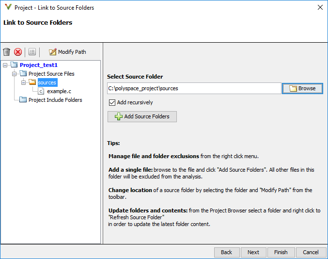 Polyspace プロジェクトでソース パスを指定します。ソース ファイルは [プロジェクト ブラウザー] ペインに表示されます。