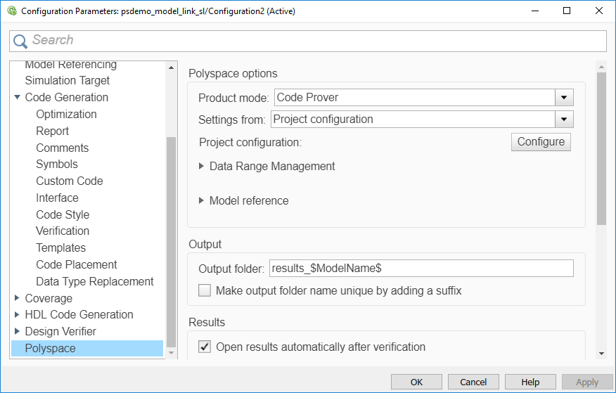 Simulink [コンフィギュレーション パラメーター] ウィンドウで Polyspace の基本的なオプションを設定するには、[アプリ] タブで [Polyspace コード検証] を選択します。次に [Polyspace] タブで [設定] または [設定] 、 [Polyspace 設定] を選択します。