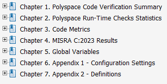 The file combined_report.pdf is saved in your current folder. Open the file and verify that the report contains code metrics, Code Prover run-time checks, and MISRA C:2023 violations.