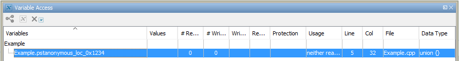 各変数とそれぞれの読み取り/書き込みアクセスについては、[変数アクセス] ペインに関連する属性があります。変数について、さまざまな属性がこの表に一覧表示されます。