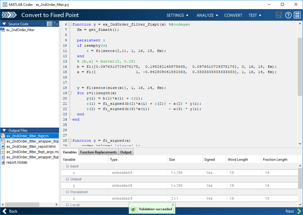 のコード違反およびコード生成の準備状態の問題が検査されます。ex_2ndOrder_filter.m