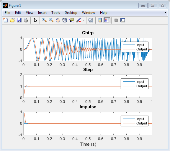 を 3 つの入力信号、チャープ、ステップ、インパルスを使用して実行します。次に、スクリプトは出力をプロットします。% ex_2ndOrder_filter_test % % Define representative inputs N = 256; % Number of points t = linspace(0,1,N); % Time vector from 0 to 1 second f1 = N/2; % Target frequency of chirp set to Nyquist x_chirp = sin(pi*f1*t.^2); % Linear chirp from 0 to Fs/2 Hz in 1 second x_step = ones(1,N); % Step x_impulse = zeros(1,N); % Impulse x_impulse(1) = 1; % Run the function under test x = [x_chirp;x_step;x_impulse]; y = zeros(size(x)); for i = 1:size(x,1) y(i,:) = ex_2ndOrder_filter(x(i,:)); end % Plot the results titles = {'Chirp','Step','Impulse'} clf for i = 1:size(x,1) subplot(size(x,1),1,i) plot(t,x(i,:),t,y(i,:)) title(titles{i}) legend('Input','Output') end xlabel('Time (s)') figure(gcf) disp('Test complete.')