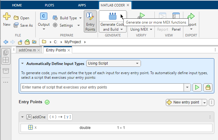 type addOne.mfunction y = addOne(x) %#codegen y = x + 1; end