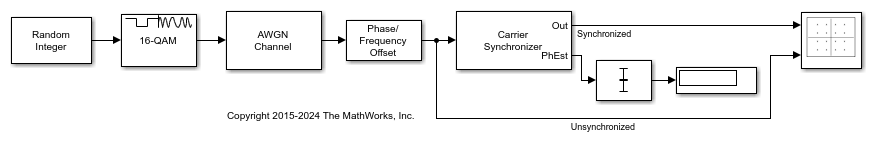 Carrier Synchronizer ブロックは、単一搬送波変調スキームを使用する信号の搬送波周波数と位相オフセットを補正します。キャリア同期装置のアルゴリズムは、BPSK、QPSK、OQPSK、8-PSK、PAM、および矩形 QAM 変調スキームと互換性があります。