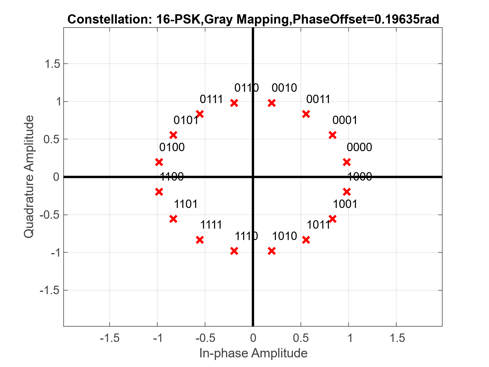 グレイ符号化には、隣接するコンスタレーション点間で変化するビットが 1 つだけであるという利点があるため、ビット エラー レート性能が向上します。