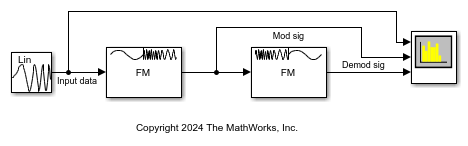FM Demodulator Passband ブロックは、周波数変調を使用して変調された信号を復調します。入力信号と出力信号は両方とも実数のスカラー信号です。