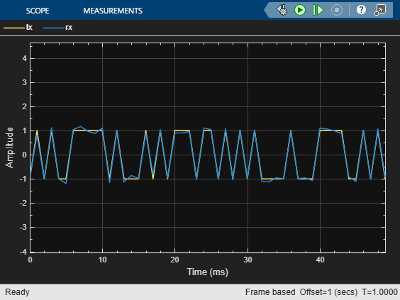 The cm_int_dump_filtering model upsamples BPSK modulated random binary data, adds noise to the data, and then applies integrate-and-dump filtering. A timescope plots the real component of samples for a frame of the transmitted random integer data (tx) and the received data after integrate and dump filtering (rx).