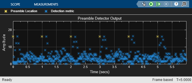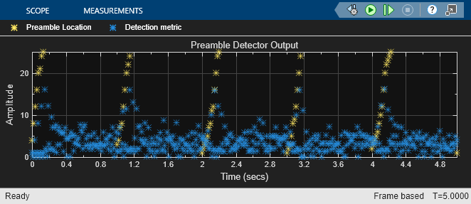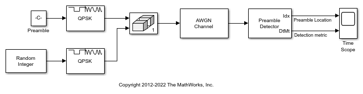 Preamble Detector ブロックはデータ パケットのプリアンブルの最後を検出します。プリアンブルは一連のシンボルまたはビットで、パケット ベースの通信システムで使用され、パケットの開始を示します。パケットはプリアンブル データとユーザー データで構成されています。パケットのユーザー データ部分の長さはシミュレーションの実行中に変動することがあります。