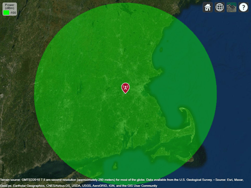Rain オブジェクトを使用して、伝送点からの電磁放射が雨の中を伝わるときの挙動をモデル化します。モデルの詳細については、[1]を参照してください。降雨伝播モデルは、1 ~ 1000 GHz で有効で、見通し内 (LOS) 条件を想定し、地形、地球の湾曲、およびその他の障害物を無視します。