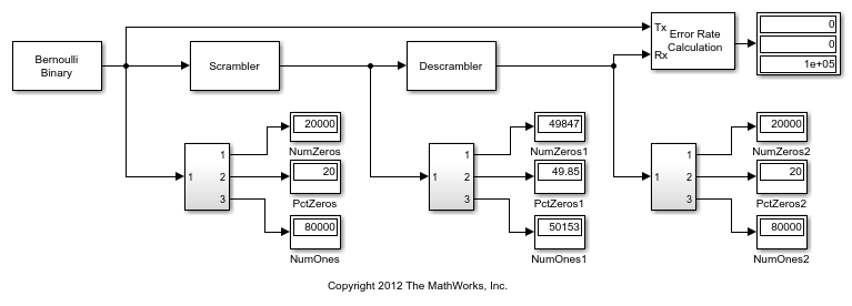入力データに加法スクランブルを適用するには、PN Sequence Generator ブロックと、XOR 論理演算子として構成された Logical Operator (Simulink) ブロックを使用できます。例については、Simulink での入力データの加法スクランブルを参照してください。
