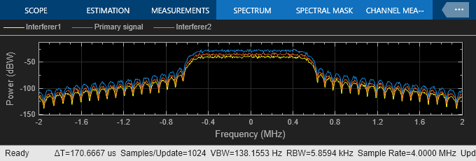 モデルの Scope ブロックは、一次信号と干渉信号のスペクトル、受信した結合信号のスペクトル、および受信信号のコンスタレーション ダイアグラムを表示します。