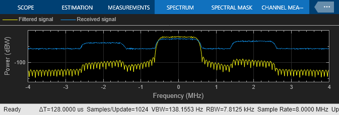 受信信号とフィルター処理された信号のスペクトル。ローパスの Raised Cosine Receive Filter ブロックは、干渉信号を除外します。