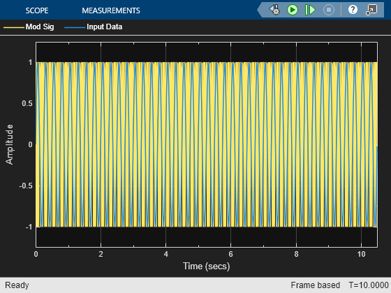 復調信号スコープは、復調器の出力 Demod Sig が入力データと完全に整合することを示しています。