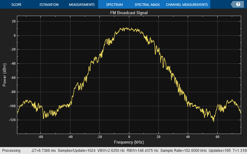saFM = spectrumAnalyzer( ... SampleRate=152e3, ... Title="FM Broadcast Signal"); saAudio = spectrumAnalyzer( ... SampleRate=44100, ... ShowLegend=true, ... Title="Audio Signal", ... ChannelNames=["Input signal" "Demodulated signal"]);
