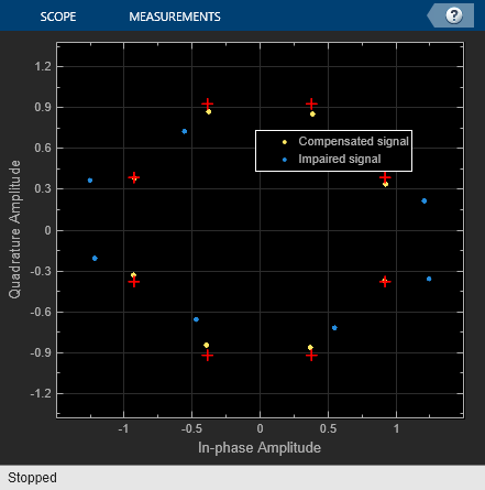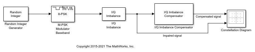 このモデルは、8-PSK 信号に I/Q の振幅と位相の不均衡を追加し、I/Q 不均衡補正を適用して劣化を補正します。信号に対する劣化要因の追加と補正の実行には、それぞれI/Q ImbalanceブロックとI/Q Imbalance to Compensator Coefficientブロックを使用します。I/Q Imbalance ブロックは、振幅の不均衡を 5 dB、位相の不均衡を 7 度、DC オフセットを 0 に設定します。