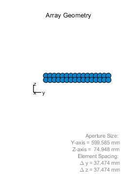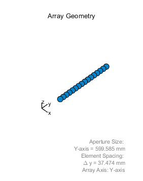 複数のビューでのアレイのジオメトリと送信アレイの応答を、プロットで示します。応答は、ステアリング角度で指定された送信方向を示します。