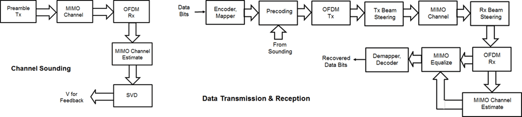 選択したシステムの場合、プリアンブル信号がすべての送信アンテナ素子全体から送信され、チャネルを調整する受信機で処理されます。受信機コンポーネントは、データ サブキャリアごとの特異値分解 (SVD) を使用して、チャネル対角化に基づいて、事前増幅、OFDM 復調、周波数領域チャネル推定、およびフィードバックの重みの計算を実行します。