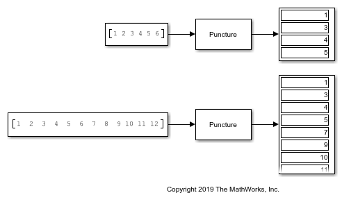 この例では、Punctureブロックを使用し、2 番目と 6 番目の要素の位置に 0 がある絶対値 6 のパンクチャ パターン [1;0;1;1;1;0] を使用して入力ベクトルをパンクチャする方法を説明します。