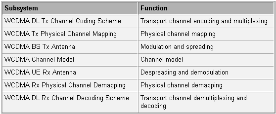 WCDMA DL Tx Channel Coding Scheme。WCDMA DL Tx Channel Coding Scheme サブシステムは、これに関連付けられているトランスポート形式パラメーターに従って個別に各トランスポート チャネルを処理します。このサブシステムは、次の機能を実装します。