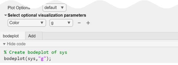 bode、step、pzplot、impulseなどの関連キーワードを入力します。提案されたコマンド候補から [プロットの作成] を選択します。この方法を使用してタスクを追加すると、MATLAB により、タスクの [可視化の選択] セクションで、対応するチャート タイプが自動的に選択されます。