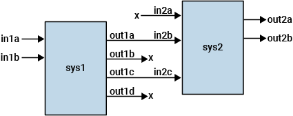 このブロック線図に示されている相互接続では、sys1 の out1a と out1c がそれぞれ in2b と in2c に接続されています。接続する信号の名前が一致するように信号名を変更します。