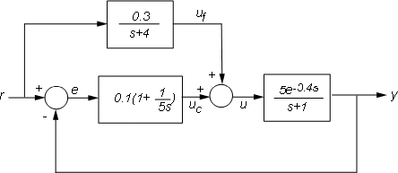 F = 0.3/(s+4); P.InputName = "u"; P.OutputName = "y"; C.InputName = "e"; C.OutputName = "uc"; F.InputName = "r"; F.OutputName = "uf"; Sum1 = sumblk("e = r - y"); Sum2 = sumblk("u = uf + uc"); Tff = connect(P,C,F,Sum1,Sum2,"r","y");