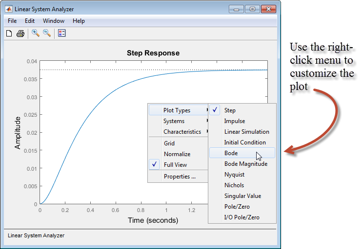 線形システム アナライザーでの作業は、右クリック メニューを使用するのが最も簡単です。以下に例を示します。