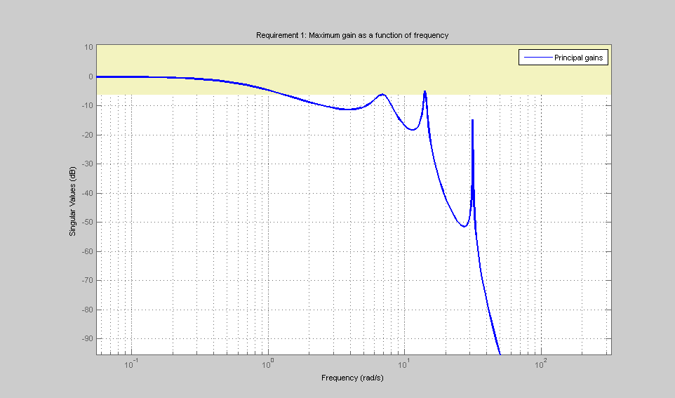影付きの領域は、制約に違反する部分を示しています。調整後、調整モデル T について viewGoal(R,T) を使用して、調整された周波数依存の余裕をこのプロットに表示できます。
