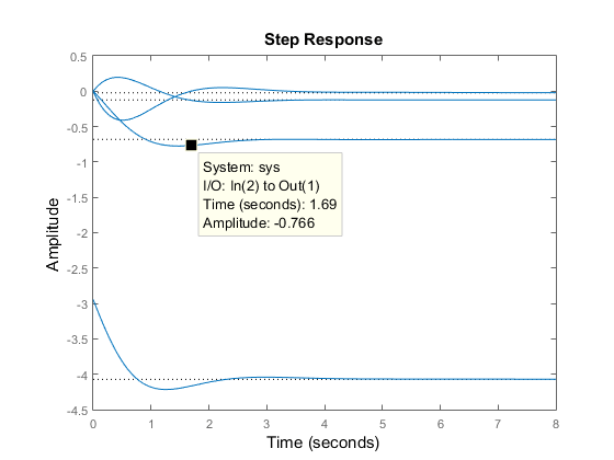 連続または離散の tf モデル、ss モデル、または zpk モデルでは、プロット コマンドを使用できます。状態空間モデルの場合は、特定の初期状態からの強制のない応答をプロットすることもできます。以下に例を示します。