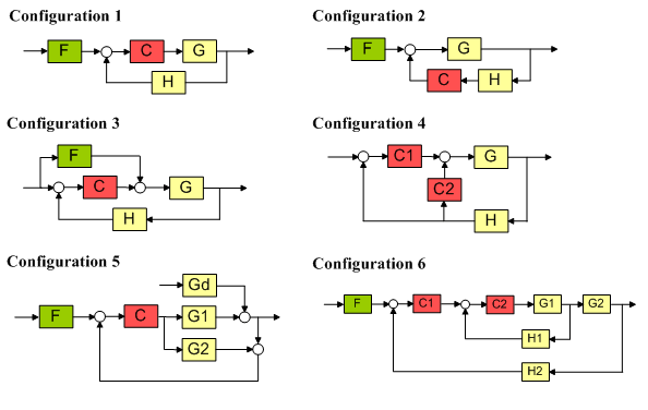 3) フィードフォワード補償とフォワード パスの補償器をもつフィードバック ループ。この設定は、通常、システムに作用する前に測定できる外乱を減衰するために使用されます。