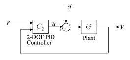 閉ループ応答を計算する際は、2-DOF PID コントローラーが 2 入力 1 出力の動的システムであることに注意してください。コントローラーは、2 つのチャネルに関連付けることができます。図に示すとおり、1 つは基準信号、もう 1 つはフィードバック信号のチャネルです (詳細については、連続時間 2-DOF PID コントローラーの表現を参照してください。)