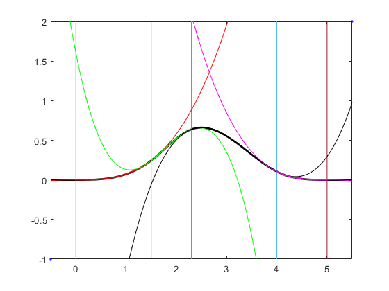 この B スプラインは、プロットの赤、緑、紫、黒の曲線、つまり、それぞれが 3 次である 4 つの多項式区分で構成されています。