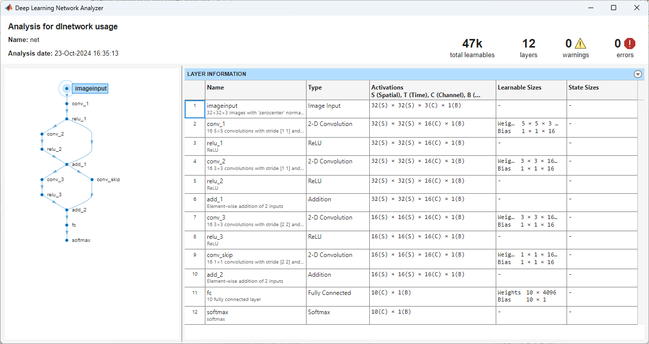 net = connectLayers(net,"conv_skip","add_2/in2");新しいアーキテクチャを解析します。新しいネットワークにはエラーが含まれず、学習の準備が整っています。