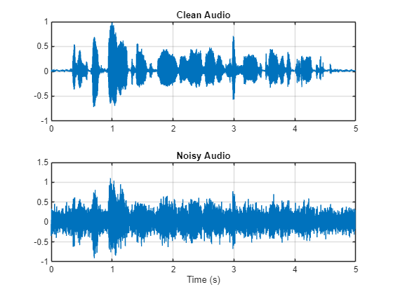 t = (1/fs)*(0:numel(cleanAudio) - 1); figure(1) tiledlayout(2,1) nexttile plot(t,cleanAudio) title("Clean Audio") grid on nexttile plot(t,noisyAudio) title("Noisy Audio") xlabel("Time (s)") grid on