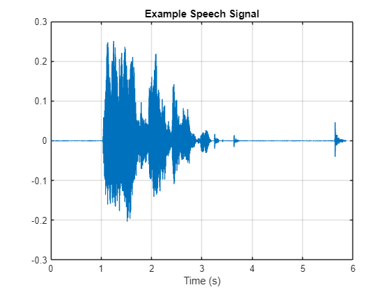 figure(2) t = (1/adsTrainInfo.SampleRate) * (0:numel(audio)-1); plot(t,audio) title("Example Speech Signal") xlabel("Time (s)") grid on