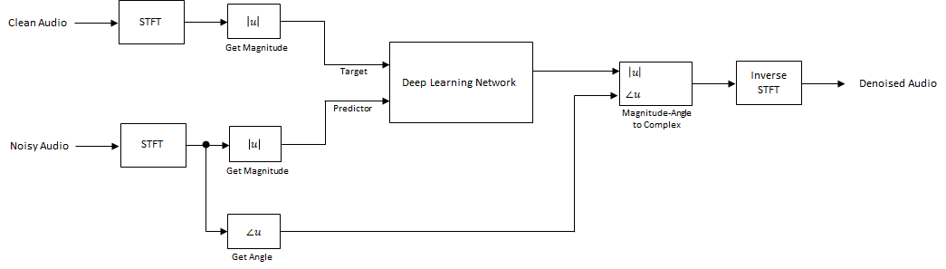 標準の深層学習の学習スキームを以下に示します。音声が通常 4 kHz 未満になるため、ネットワークの計算負荷を減らすために、最初にクリーンなオーディオ信号とノイズを含むオーディオ信号を 8 kHz までダウンサンプリングすることに注意してください。予測子とターゲットのネットワーク信号は、それぞれノイズを含む信号とクリーンなオーディオ信号の振幅スペクトルです。ネットワークの出力はノイズ除去後の信号の振幅スペクトルです。回帰ネットワークは、予測子入力を使用して、出力と入力のターゲット間の平均二乗誤差を最小化します。ノイズ除去後のオーディオは、出力振幅スペクトルとノイズを含む信号の位相を使用して時間領域に戻されます [2]。