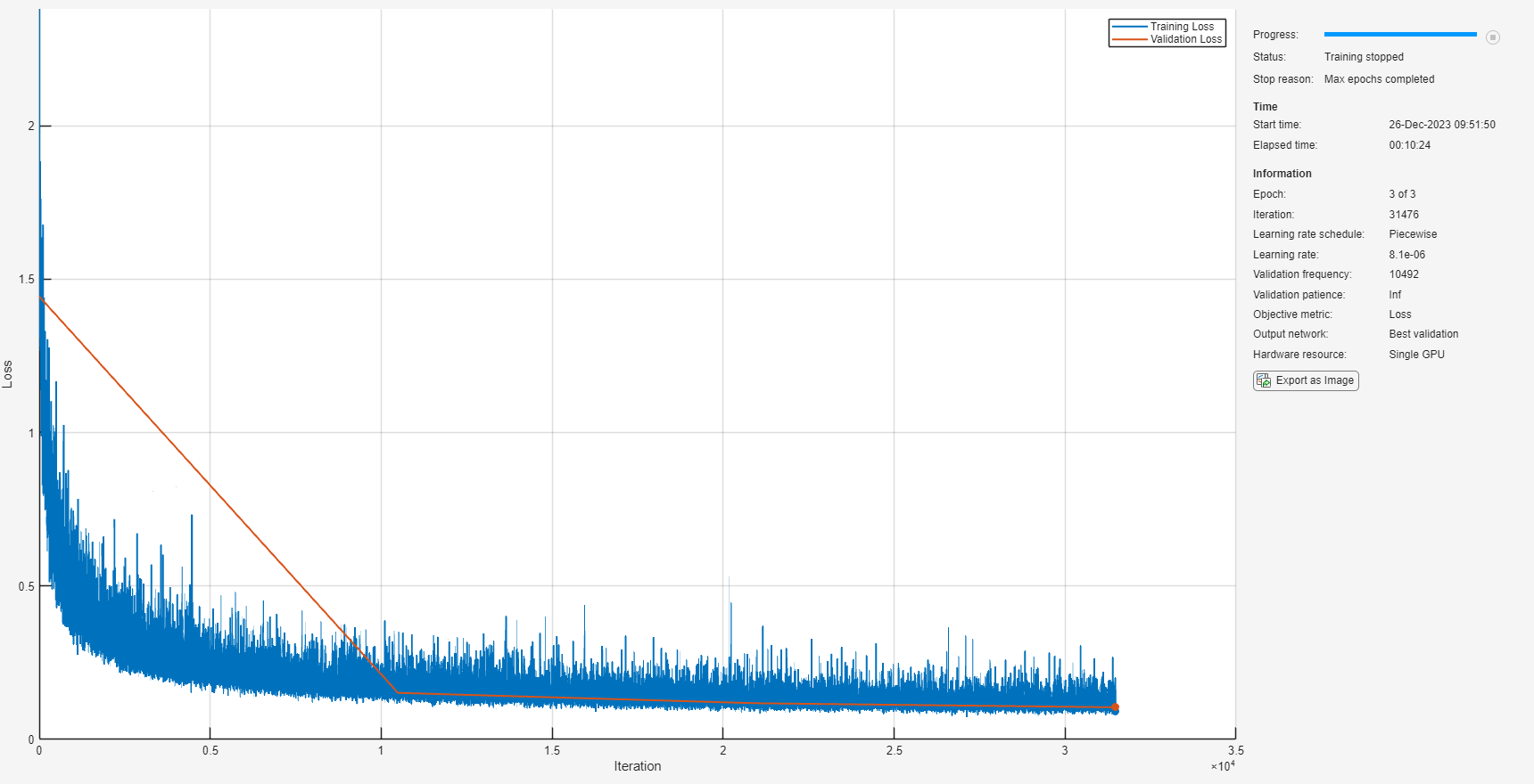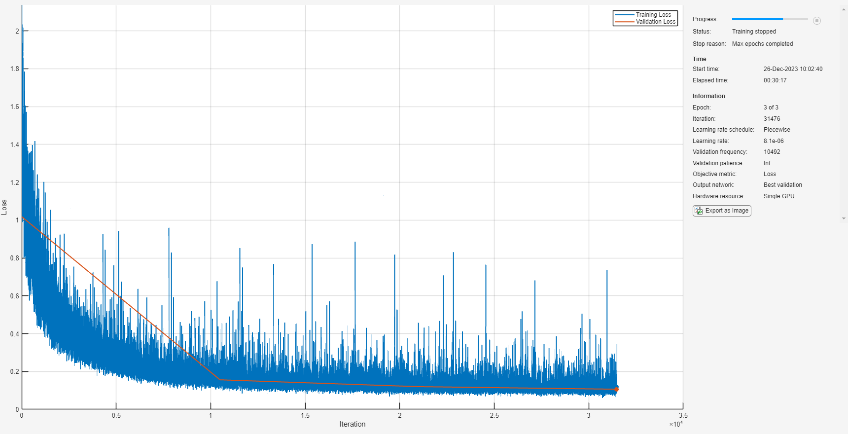 options = trainingOptions("adam", ... MaxEpochs=3, ... InitialLearnRate=1e-5, ... MiniBatchSize=miniBatchSize, ... Shuffle="every-epoch", ... Plots="training-progress", ... Verbose=false, ... ValidationFrequency=floor(size(trainPredictors,4)/miniBatchSize), ... LearnRateSchedule="piecewise", ... LearnRateDropFactor=0.9, ... LearnRateDropPeriod=1, ... ValidationData={validatePredictors,permute(validateTargets,[3 1 2 4])});