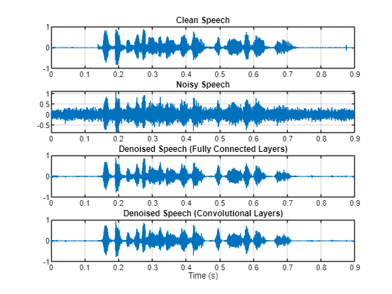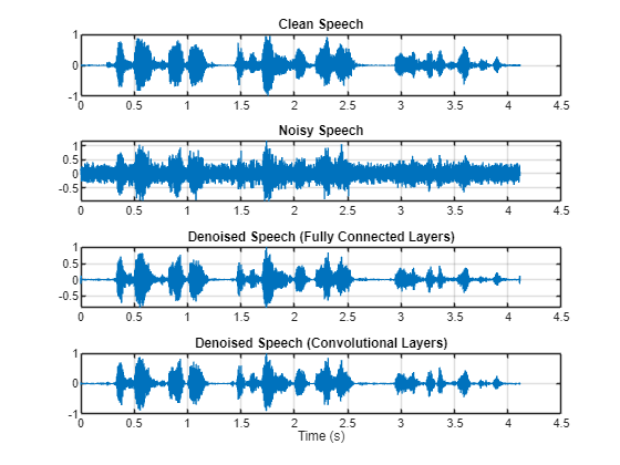 t = (1/fs)*(0:numel(denoisedAudioFullyConnected)-1); figure(3) tiledlayout(4,1) nexttile plot(t,cleanAudio(1:numel(denoisedAudioFullyConnected))) title("Clean Speech") grid on nexttile plot(t,noisyAudio(1:numel(denoisedAudioFullyConnected))) title("Noisy Speech") grid on nexttile plot(t,denoisedAudioFullyConnected) title("Denoised Speech (Fully Connected Layers)") grid on nexttile plot(t,denoisedAudioFullyConvolutional) title("Denoised Speech (Convolutional Layers)") grid on xlabel("Time (s)")