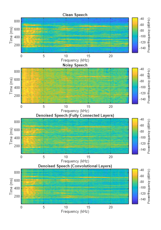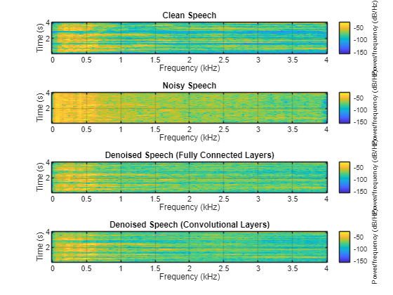 h = figure(4); tiledlayout(4,1) nexttile spectrogram(cleanAudio,win,overlap,fftLength,fs); title("Clean Speech") grid on nexttile spectrogram(noisyAudio,win,overlap,fftLength,fs); title("Noisy Speech") grid on nexttile spectrogram(denoisedAudioFullyConnected,win,overlap,fftLength,fs); title("Denoised Speech (Fully Connected Layers)") grid on nexttile spectrogram(denoisedAudioFullyConvolutional,win,overlap,fftLength,fs); title("Denoised Speech (Convolutional Layers)") grid on
